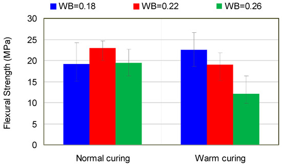 As shown in Figure 8, the 28-day flexural strength of RPC shows the same trends as for the compressive strength. For normal temperature curing, when the WB increased from 0.18 to 0.22, the flexural strength of the RPC mixture increased, but a further increase of the WB from 0.22 to 0.26 led to a strength drop. For warm temperature curing, the flexural strength of RPC mixtures generally decreased as the WB increased. Therefore, higher early-age temperature curing leads to higher early flexural strength and lower long-term flexural strength.