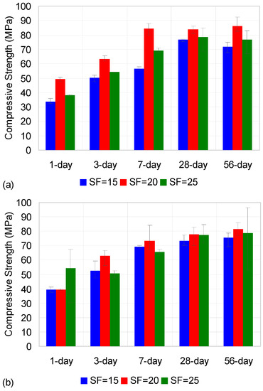 The effect of SF content on the compressive strength is presented in Figure 9. A similar trend has been observed for all of the curing periods, regardless of the curing temperature: increasing the SF content from 15% to 20% results in an increase in the compressive strength of RPC. However, further increasing the SF content from 20% to 25% drops the compressive strength down. This implies that the addition of SF improves the compressive strength of RPC up to a certain optimum point, but a further increase in the SF content does not result in additional strength gain. It is possible to state that the optimum amount of SF induces a strong bonding between the cement paste and the aggregate due to the filler packing effect and the pozzolanic reaction of SF. This enhanced adhesion results in a much stronger transition zone, and thus leads to a more even distribution of stresses within the concrete volume, and ultimately to larger compressive strength. However, the addition of an excessive amount of SF to the mixture does not provide continuous strength development because of the limited pozzolanic reaction. When the WB is kept constant, an increase in the SF content results in a situation where the silicates are in excess, and the CH produced by cement hydration is deficient. Hence, there is no more pozzolanic reaction that produces calcium silicate hydrate (C–S–H) lattice forms related to strength development. The other possible reason to bring the decrease of compressive strength is that the addition of an excessive amount of SF to the mixture may cause an incompatibility issue (interactions between acceptable materials that result in unexpected or unacceptable performance). Therefore, further investigation is required in order to identify this result.