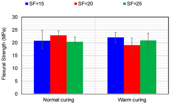 Figure 10 shows the 28-day flexural strength of RPC. Similar to the compressive strength results, when the SF content increased from 15% to 20%, the flexural strength of the RPC mixture increased, but a further increase of SF content up to 25% led to strength drop. Interestingly, no typical trend was observed for warm temperature curing, but this can be explained by the porosity to density ratio (P/D): the lower the P/D, the higher the flexural strength. As presented in Table 4, the mixture with low flexural strength has a higher porosity and lower density. For example, while the porosity and density of the mixture containing 15% SF are 8.16% and 2.24 g/cm3, those properties of the mixture containing 20% SF are 11.35% and 2.20 g/cm3, respectively. In other words, the P/D of the former is 3.65, and the P/D of the latter is 5.15.