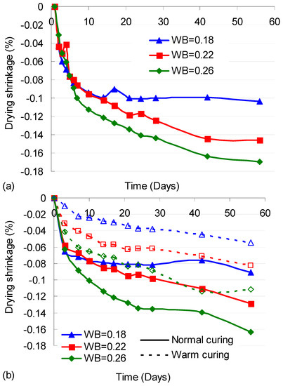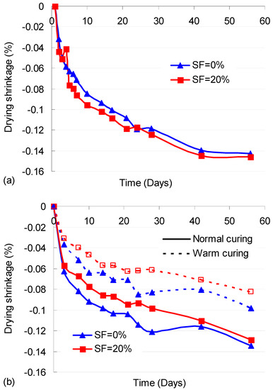The drying shrinkage characteristics of a plain concrete mixture and RPC mixture containing 20% SF are illustrated in Figure 11. As expected, for one-day air curing (Figure 11a), plain concrete has less drying shrinkage than RPC. It is well known that the drying shrinkage of concrete relies on cementitious material content, water content, paste content, sand content, water permeable porosity, and strength level [39]. The higher the paste content of concrete, the higher the drying shrinkage. It was calculated that the volumetric paste contents of plain concrete and an RPC mixture 0.22WB-20SF from Table 1 are 0.672 m3 and 0.647 m3, respectively. Thus, the higher value of the drying shrinkage of RPC is due to the higher paste content.