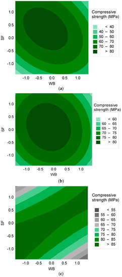 Minitab software was used to perform RSM analysis to identify the combined effect of the WB and SF content change on the compressive strength of RPC for each curing period. As shown in Figure 13, both the SF content and the WB influence the compressive strength of RPC. Contour plots clearly present that the strength response surface possesses a dark green color area, and the light green colored area and grey colored area indicate high strength and low strength, respectively. For instance, as shown in Table 2, the mixture 0.22WB-20SF with coded values of WB (0) and SF (0) is located in the darkest green area in the 7-day contour plot. The area under this intersection represents the compressive strength value of 84.5 MPa, which indicates the highest compressive strength. On the other hand, the mixture 0.22WB-15SF with coded values of WB (0) and SF (−1.4142) has a very light green color, which indicates the lowest compressive strength. This trend is the same in the 28-day and 56-day contour plots.