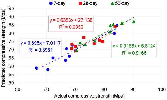 Minitab software was also used to perform quadratic regression analysis for the compressive strength of RPC. Equations 6–8 indicate the modeling equations of the effect of the WB and SF on 7-day, 28-day, and 56-day compressive strengths. The accuracy of the model was evaluated based on the R2 values for each age. Figure 14 shows the regression analysis results. As shown in Figure 14, the R2 values for the 7-day, 28-day, and 56-day compressive strengths are 89.81%, 63.52%, and 91.66%, respectively. The variation of R2 values at different ages may be associated with the pozzolanic reaction of the SF. While the hydration of cement mainly dominates the early age strength development of RPC, the pozzolanic reaction, which reacts with calcium hydroxide (CH) to form C–S–H, fully charges the strength development at 56 days. This cement hydration and pozzolanic reaction respond to high R2 values at both ages (7 days and 56 days). The relatively low R2 value at 28 days may be attributed to the transition period of the ongoing pozzolanic reaction. It should be noted that all of the RPC mixtures that are used for RSM analysis were cured at a normal temperature (23 ± 2 °C), which provide a relatively slow pozzolanic reaction.