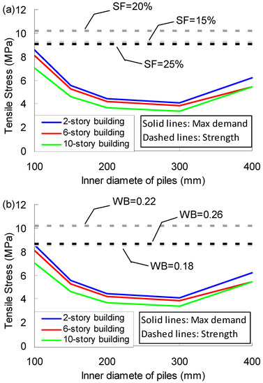 Figure 15 compares the maximum tensile stress demand and the tensile strength of the RPC. The maximum tensile stress demands in the pile, which are plotted as solid lines, were obtained from the simulations for different design cases by varying number of stories (2-story, 6-story, and 10-story buildings) and the inner diameters of the piles. The tensile strength that was calculated based on the test results is plotted as horizontal dotted trend lines for (a) different SF contents (at WB = 0.22) and (b) different WB (at SF = 20%). The tensile strength was calculated by dividing the 28-day normal curing flexural strength (refer to Figure 8 and Figure 10) by a factor of 2.5, as proposed in Kim and Tahah [40]. As seen in Figure 15, the RPCs that are studied in this paper generally have higher tensile strength than the maximum circumferential tensile stress demand obtained from the simulations, which indicates that the RPC is potentially suitable for the energy storage pile application. The mixture design with a combination of WB = 0.22 and SF = 20% provides the highest tensile strength of the RPC.