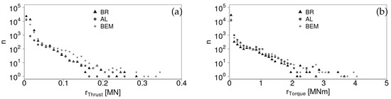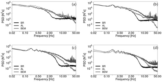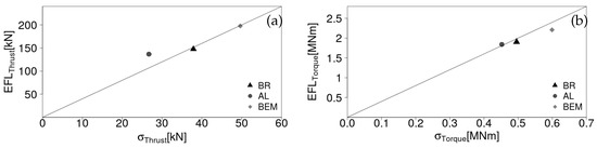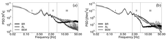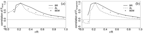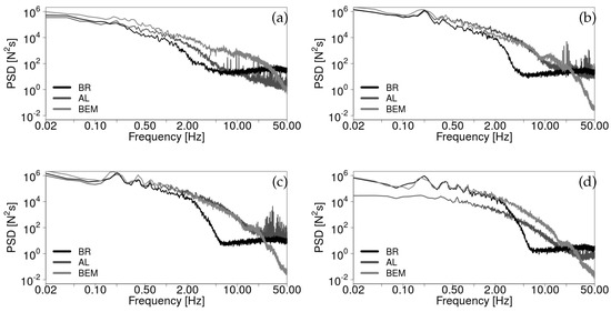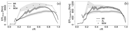 - BEM: This method uses wind fields recorded in the CFD domain on an equidistant 31 × 31 grid with a grid cell size of 4.5 m in both directions. In this case the fields are obtained at the position of the rotor from the same mesh as for the AL method but in an empty CFD domain. This seems to be a reasonable choice, because under this condition the TI at the rotor will be comparable for the CFD and BEM simulations. The BEM based tool FAST v8 [18] in combination with AeroDyn v15 [19] with the Beddoes Leishman type unsteady aerodynamics model [19,20] and an equilibrium wake model is used in this work. The BEM model relies on the very same airfoil data and correction models as the AL, but with only 17 blade sections. Because of the simplicity of the BEM approach the simulation with the same time stepping and total time as for the higher fidelity approaches only took two minutes on one core.