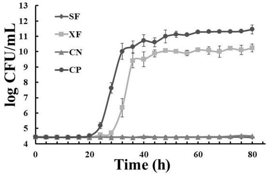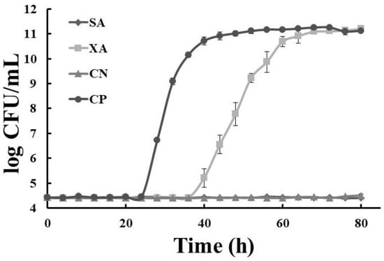 Growth kinetics of Streptococcus mutans in unsterilized extracts: (♦) dragon’s blood rhizomes (5 mg/mL); (■) xoconostle (5 mg/mL); (▲) negative control (chlorhexidine); (●) positive control; SA: unsterilized dragon’s blood rhizome extract, XA: unsterilized xoconostle fruit extract; CN: control negative; CP: control positive.