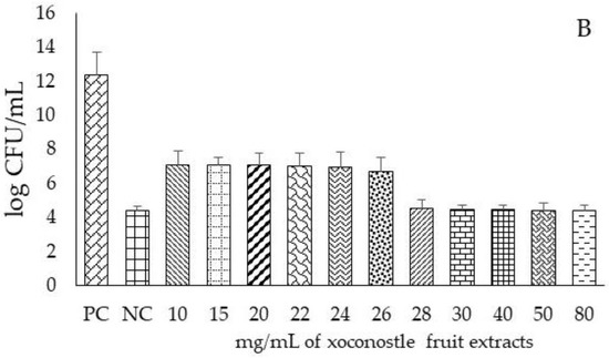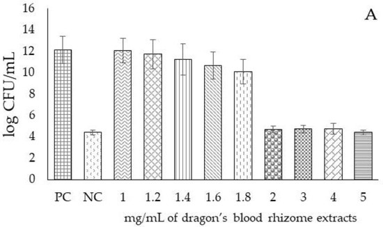 Log CFU/mL of S. mutans at different concentrations of dragon’s blood rhizome extract (A) and different concentrations of xoconostle fruit extract (B), autoclave-sterilized and inoculated at 96 h; PC: positive control (S. mutans); NC: negative control (chlorhexidine); the concentrations of the extracts are reported in mg/mL.
