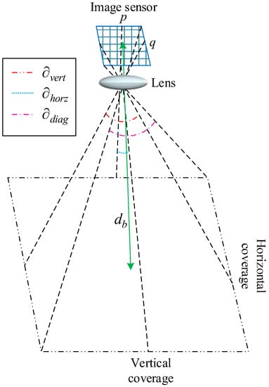 It can be noticed that a large focal length effectively contributes to high-distance communication. Here, it is worth mentioning that  signifies the size of the image sensor per pixel. The focal length determines the total AOV of the camera. From Figure 3, the AOV can be measured horizontally, vertically, or diagonally. The AOV of a camera with sensor dimensions of  can be expressed as