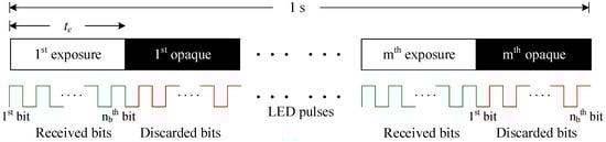 The shutter speed indicates the length of time for which a frame is exposed to light. The shutter speed plays an important role in OCC. A low shutter speed leads to blurring as the LED switches at a high speed. This increases the BER significantly. The shutter speed should be more than twice the frame rate for secure communication. Moreover, the shutter speed should be synchronized with the LED flickering rate as the synchronization establishes how many bits are transmitted during one exposure. As shown in Figure 5, the total number of detectable bits during one exposure is . We assume that every pixel of the image sensor is exposed to light for the same amount of time. The opaque portions represent the closed periods of the camera shutter. For simplicity, we consider that the on and off periods of the camera shutter are the same and the total number of exposures per second is m. After synchronization, the number of detectable transmitted bits per exposure can be represented as