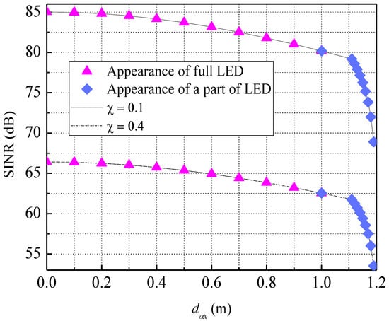 The variation of the SINR by changing the horizontal distance between the camera and the LED.