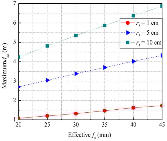 The LED size has a profound impact on OCC performance. A large LED will occupy a high amount of pixels inside the image sensor resulting in a large number of strips. Consequently, the maximum communication distance will be comparatively high. The size of the strips depends on the read-out time and the LED modulation frequency. As discussed in Section 3, the minimum number of strips below which the camera cannot extract the information of the projected image depends on the LED size and the focal length of the camera. Figure 10 shows the number of pixels occupied by the projected image inside the image sensor at different distances from the LED to the camera with different LED sizes and a constant effective focal length of 26 mm. We kept  and  was varied during performing the simulation to keep the LED at the center. In addition, the LED flickering rate was set to 1.5 kHz resulting in 70 pixels to construct one strip. The minimum number of strips corresponds to the maximum communication distance, which also depends on the focal length. Figure 11 illustrates how the maximum communication distance varies with respect to the LED size and the effective focal length. It can be seen that the maximum communication distance can be enhanced using larger LEDs. Compared to an LED size of 1 cm, the communication-distance improvement of 2.5 and 4 times can be noticed for LEDs with 5 cm and 10 cm, respectively. Both simulations in Figure 10 and Figure 11 were performed at a constant noise spectral density of . It is worth stating that effective communication will be achieved if the LED is clearly focused on the camera; otherwise, it will result in a significant increase in the BER. Moreover, there is a minimum SINR below which data bits cannot be decoded.