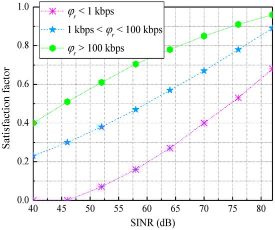 As discussed in Section 5, user satisfaction with OCC depends on the service types and requirements. A user making a voice call requires a lower data rate compared to a user engaged in a video call. However, a user who uses OCC for LBS requires a good SINR rather than a high data rate. Figure 14 illustrates the variations in the user satisfaction factor with respect to SINR, evaluated in terms of different data rates. This evaluation is generalized with a satisfaction factor above 0.5 considered as good and a factor above 0.8 as excellent.