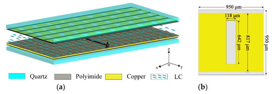The nematic LC is an anisotropic material, which can be explained by its rod-like molecular structure. The electromagnetic properties of the LC, such as relative permittivity and loss tangent, depend on the LC molecules []. The orientation of LC molecules can be coordinated by the align layer and the external electric field. In the align layer, the grooves were created along a certain direction by mechanical friction, and the liquid crystal molecules are parallel to the groove under the groove anchoring energy. As shown in Figure 1a, the liquid crystal molecules’ orientation is parallel to the y-axis. If an external electric field is added, the orientation of the molecules will be forced parallel to electric field direction. By adjusting the external electric field, the relative permittivity of LC can be continuous controlled and resonant frequency of unit cells simultaneous changed. Many electrically tuned devices based on LC technology have been reported, such as phase shifters [,], absorbers [,], and filters [,,].