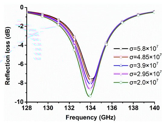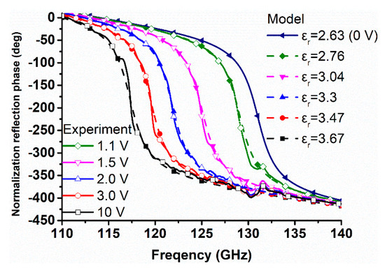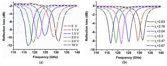 The measured reflection amplitude at different voltages is presented in Figure 8a, wherein it can be seen that by increasing the bias voltage, the resonant frequency changed from 132 GHz (0 V bias) to 116 GHz (10 V bias). At the bias voltage of 10 V, most of the LC molecules were oriented parallel to the electric component of the static electric field, resulting in the relative permittivity similar to ε//. The loss of device is consisted of the ohmic loss in the copper layer, the absorption loss in the quartz plate and the LC layer, and resonant loss []. The test results also include the loss in free space, scattering loss, and receiving loss. As shown in Figure 8b, the simulation of reflection amplitude at different dielectric properties is obtained.