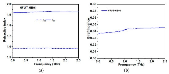 (a) Refractive index of liquid crystals at T = 25 °C; (b) Birefringence of liquid crystals at T = 25 °C.
