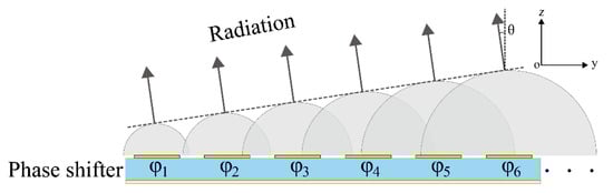 As shown in Figure 1a, the proposed three-dimensional phase shifter. The unit cell is formed by two quartz plates (εr = 3.75; tanδ = 0.002), which are separated by the polystyrene microspheres and contain a 45 μm-thick LC. The copper patches which are printed on the quartz by evaporation method, have a conductivity of 5.8 × 107 S/m and thickness of 500 nm. As shown in Figure 2, the reflection coefficients of the phase shifter have been simulated at different conductivity. It can be seen that reflection losses will increase as the metal conductivity decreases. Moreover, the thin polyimide (PI) layer is spin-coated on the copper surface to align the direction of unbiased LC molecules. The LC mixture (HFUT-HB01) is used in simulation and design. Its ordinary, extraordinary refractive indices are about 1.58 and 1.92 at 125 GHz, measured by terahertz time domain spectroscopy, as shown in Figure 3. Where its relative permittivity in the unbiased state (ε⊥) and the fully biased state (ε//) was set to 2.47 and 3.6, respectively []. In the simulation, the loss tangent of the LC layer was set to 0.02. In each row all the cells are separated by an isolation slot to realize one-dimensional scanning. Figure 1b shows the geometrical dimensions of the resonant layer. The metal layer was separated by a 127 μm void at the x-axis. The list of the unit cell (along the x-axis) was connected, with the same bias voltage, and provided the same phase shift. The phase of the reflected wave is being adjusted at each row element, and a beam directing in the angle of θ can be obtained in the far field as shown in Figure 4.