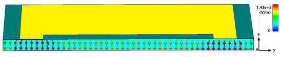 The static electric field, which is distributed among the LC layer, is the most important characteristic of the LC tuned devices. We simulated the electric field’s direction and strength using the external electric field. The magnitude and direction of the external electric field in the center of x-axis cutting plane, when the 10 V voltage was applied to the two metal layers is shown in Figure 5. The electric field magnitude is defined by a color bar. The comprehensive analysis of the electric field direction and strength was conducted, and as it can be seen in Figure 5, after applying a bias voltage, the electric field in the LC layer was mostly uniform and parallel to the z-axis, and LC molecules’ direction was parallel to the z-axis.
