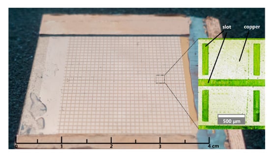 In this section, we experimentally validate the proposed phase shifter. The performance of the proposed LC-based phase shifter was analyzed by numerical finite difference time domain (FDTD) simulation. The prototype was fabricated by the ultraviolet light photoetching combined with the wet etching. The fabrication process consisted of the vacuum copper plating, photoresist spin coating, exposure, development, and wet etching. The sample and microscope image of the unit cell are shown in Figure 6, where it can be seen that the sample consisted of a 30 × 30 unit cells, printed on the 40 × 40 mm2 area on a quartz substrate with the thickness of 520 mm and thickness tolerance of ±10 μm. The unit cell structure had a dimensional tolerance of ±4 μm on the wide side and ±1 μm on the narrow side.