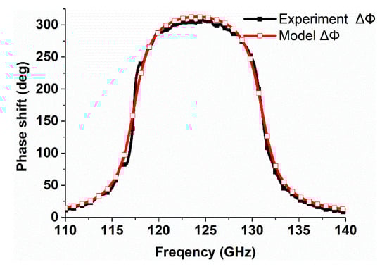 The simulation and experimental results in the working frequency range are presented in Figure 9. All phases were normalized relative phases to the simulated 0 V phase curve. The best-fit values for the LC substrate were shown to be ε⊥ = 2.63 at 0 V and ε// = 3.67 at 10 V. There was an approximate match between the predicted shift in the resonant frequency and the normalized experimental values of the phase test at bias voltages of 1.1 V, 1.2 V, 1.5 V, 2 V, 3 V, and 10 V. By increasing the bias voltage the resonant frequency was reduced and the matching relative permittivity was increased. As shown in Figure 10, the prototype achieved a phase shift of about 300° over the frequency range 121.5–126 GHz (3.6% tunable rage). The maximum phase shift of 306° occurred at 124.5 GHz. Tunable phase shift as a function of the applied voltage is shown in Figure 11. Compared with the simulation results, the maximum phase shift error was less than 12° in the working frequency range. This phase shift error might be caused by the following reasons. First, the device was not an infinite periodic structure as it was in the simulation, so there might be some effects caused by the boundary conditions. Second, there were finite fabrication tolerances. Third, the numerical analysis was carried out assuming the ideal LC layers, where the relative permittivity varied continuously between ε⊥ and ε//. The assumption of isotropy and homogeneity for each state of the relative permittivity of the LC in the cell might produce a small interfering resonance within the reflected field.