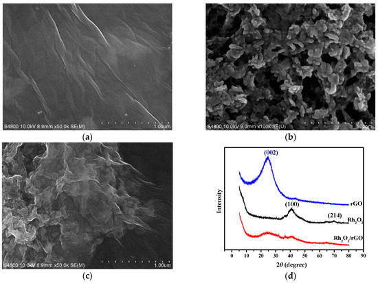 Pure GO exhibited a typical silk fold surface (Figure 1a), corresponding to a much higher surface area than GO. As for Rh2O3–NP, it displayed uniform three-dimensional characteristics composed of network structures (Figure 1b). The Rh2O3 nanoparticles were wrapped by the gauze-like GO, while a relatively smoother surface was observed in the Rh2O3–GO composite, compared with that of the Rh2O3–NPs (Figure 1c). In XRD spectra of rGO (Figure 1d), the peak at 2θ = 28.4° belonged to the characteristic reflection of graphite (002). The wide diffraction peaks at 2θ = 40° and 70° can be attributed to the diffractions of (100) and (214) planes of Rh2O3 (Figure 1d). Totally, the XRD pattern of Rh2O3–rGO indicated the successful preparation of the Rh2O3–rGO composite.