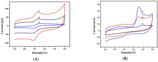 (A) CVs of (a) bare GCE, (b) rGO/GCE, and (c) Rh2O3–rGO/GCE in the solution of 1.0 mM [Fe(CN)6]3−/4− (1:1) and 0.1 M KCl; (B) CVs of (a) bare GCE, (b) rGO/GCE, and (c) Rh2O3–rGO/GCE in the solution of 20 μM BPA.