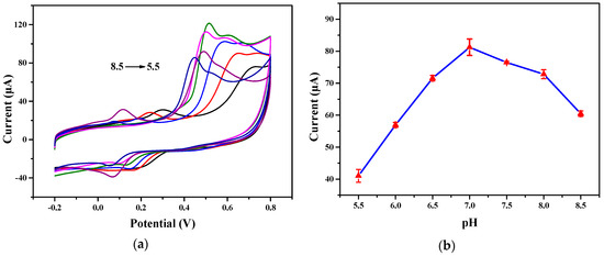 (a) CVs of Rh2O3–rGO/GCE detected BPA with different pH; (b) effects of pH on the peak current of BPA at Rh2O3–rGO/GCE.