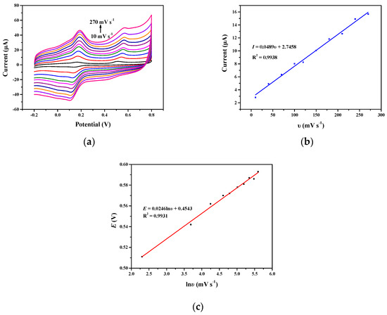 To assess the electrocatalytic behaviors of BPA at Rh2O3–rGO/GCE, scan rates from 10 to 270 mV s−1 were studied (Figure 4). Oxidation peak current (I, μA) of BPA was linearly increased with the scan rate (Ʋ, mV s−1) with R2 = 0.9938, and the relationship can be expressed by the linear regression Equation (1).