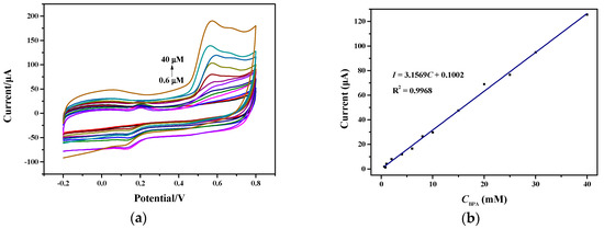 (a) CVs of Rh2O3–rGO/GCE with BPA concentration from 0.6 to 40 μM; (b) Relationship between the oxidation peak current and the concentration of BPA (from 0.6 to 40 μM).