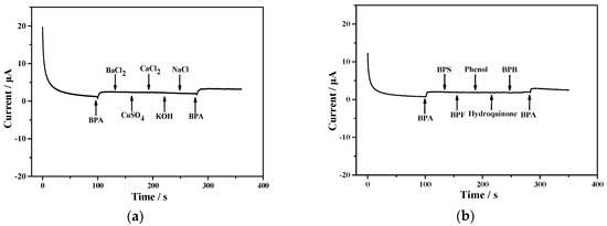 The i–t curves of bisphenol A by the addition of (a) different inorganic ions and (b) BPA analogs.