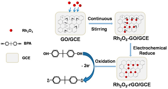 Schematic diagram for electrochemical synthesis of the Rh2O3–rGO electrode, and the electrochemical oxidation process of BPA by Rh2O3–rGO/GCE.