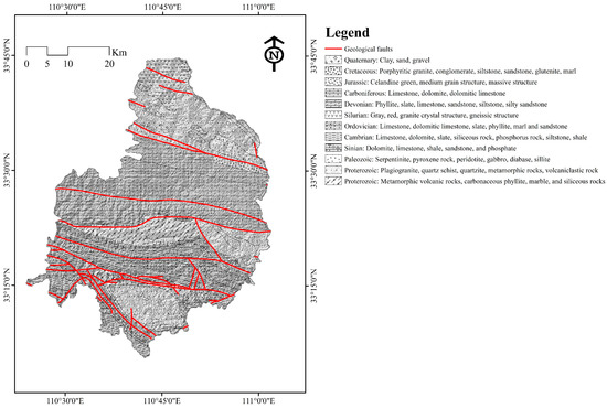 Geologically, the study area is located at the border zone of the North China and the Yangtze plates, and spans multiple stratigraphic regions from north to south. Therefore, the lithologies of the stratum are obviously different. The strata in the region are dominated by the Archean to Ordovician periods, and Devonian and Carboniferous are partially outcropped (Figure 2). Five major faults divide the study area into distinct structural zones: (1) Shangnan-Danfeng fault (NW–SE direction); (2) Zhulinguan-Taifenglou large fault (W–E direction); (3) Banyan-Yaolinghe fault (NW–SE direction); (4) Bailuchu-Weijiatai fault (NW–SE direction); and (5) Shiliping-Sanguanmiao fault (W–E direction).
