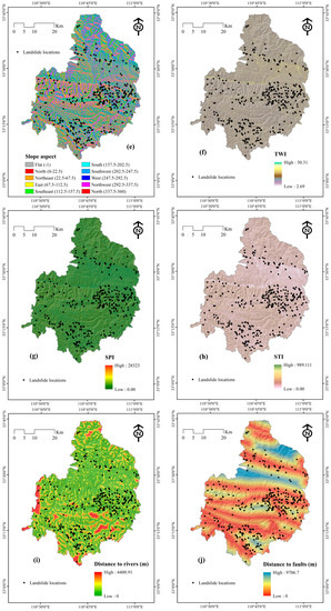 Landslide conditioning factors: (a) Altitude; (b) plan curvature; (c) profile curvature; (d) slope angle; (e) slope aspect; (f) topographic wetness index (TWI); (g) stream power index (SPI); (h) sediment transport index (STI); (i) distance to rivers; (j) distance to faults; (k) distance to roads; (l) normalized difference vegetation index (NDVI); (m) land use; (n) lithology and (o) soil.