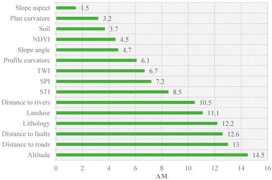 In the present study, the least support vector machine (LSSVM) [59] and average merit (AM) criteria [60,61] were applied for the selection of the proper conditioning factors as well as determining their importance. The results showed that all selected conditioning factors have an impact on landslide occurrences in the Shangnan area, China. Altitude has the greatest impact on landslide occurrences (AM = 14.5), followed by distance to road (AM = 13), distance to fault (AM = 12.6), lithology (AM = 12.6), land use (AM = 11.1), distance to river (AM = 10.5), STI (AM = 8.5), SPI (AM = 7.2), TWI (AM = 6.7), profile curvature (AM = 6.1), slope angle (AM = 4.7), NDVI (AM = 4.5), soil (AM = 3.7), plan curvature (AM = 3.2), and slope aspect (AM = 1.5) (Figure 4). Thus, the most effective conditioning factors are altitude, distance to road, and distance to fault, which aligns with results of Tien Bui et al. [33] and Chen et al. [39]. As all 15 landslide conditioning factors positively contribute in the study area, all were used for further analysis.