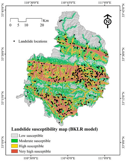 Landslide susceptibility map using the bagging-based two-class kernel logistic regression (BKLR) model.