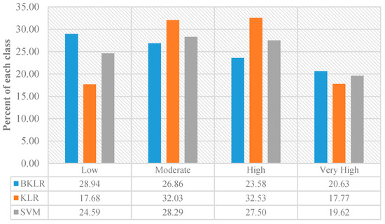 The final model results produce a landslide susceptibility map, which can be used as an effective tool for managing future landslide occurrences. These maps were constructed following these steps. Firstly, the whole study area was converted to pixels using ArcGIS (Esri, CA, USA) software. Then, the training dataset was trained in a training phase, then all pixels were predicted based on the learned trend and assigned in unique indexes. Next, all indexes were classified based on the natural breaks (Jenks) classification scheme [62,63]. Finally, these indexes for the three models were classified into four classes: Low, moderate, high, and very high susceptibility (Figure 5, Figure 6 and Figure 7). The percentage of area covered by low, moderate, high, and very high susceptibility for the three models is shown in Figure 8. For the BLRK model, these areas are 28.94%, 26.86%, 23.58%, and 20.63%, respectively. For the KLR model, they are 17.68%, 32.03%, 32.53%, and 17.77%, respectively, and for SVM, the area percentages are 24.59%, 28.29%, 27.50%, and 19.62%, respectively.