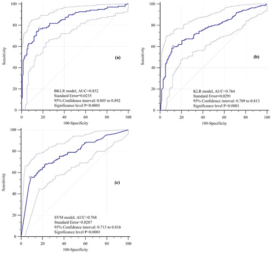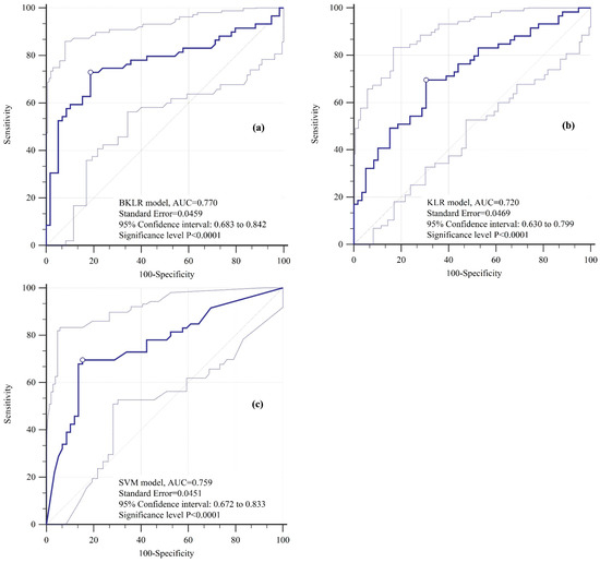 ROC curves using the validation dataset: (a) BKLR model, (b) KLR model, (c) SVM model.