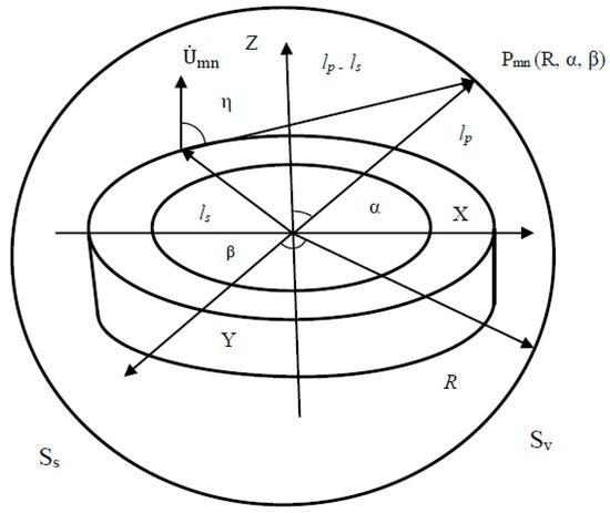 where is Bessel function of order n, (α, β) are the cone and azimuthal angles of the observation positions, respectively, is the angle between the surface normal vector and the vector from source position to receiver position, and A is the Hankel transform. According to the far field condition, Rd in the denominator is approximated by R where R = || is considered to be radius of the sphere. Consider that on a sphere Sv the observation positions are represented by some points having equal angular increments (). If ‘’ represents the small increment in the circumferential direction of the plate, at all of the observation positions, the sound pressures is given by Equations (4)–(6). The modal sound power Smn for the (m, n)th mode [10,16] from the far-field is given by Equation (7):