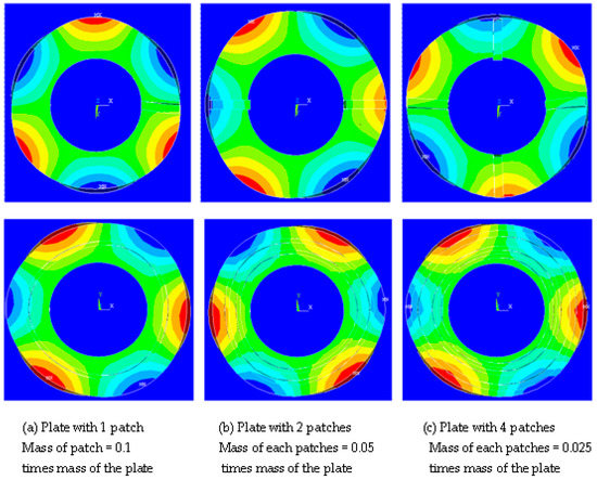 Plate with different arrangements of rectangular and concentric stiffener patches with (0, 3) modes.