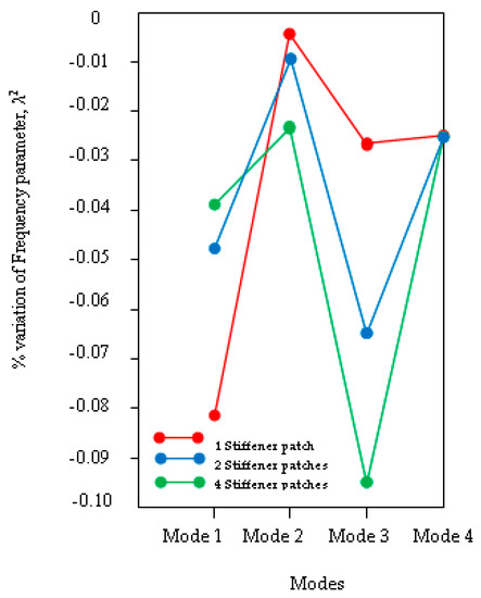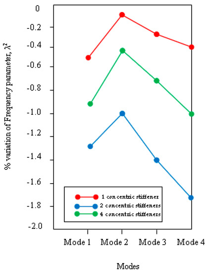 In this paper, the effect of the natural frequency parameter (λ2) is investigated for annular plates with different attachment of rectangular and concentric stiffener patches for different positions. The analysis is made for annular plates with different cases of parabolic thickness variations keeping the mass of the plate plus patches constant. Table 3 compares the first four natural frequency parameters numerically of a uniform unloaded plate for taper ratio, Tx = 0.00, with different attachments of rectangular and concentric stiffener patches along with the percentage variation of λ2. It is clear from Table 3 that the plate with different arrangements of rectangular stiffener patches has the same effect of natural frequency parameters as that of the unloaded plate for taper ratio, Tx = 0.00. However, for concentric stiffener patches, the natural frequency parameter decreases with addition of patches and minimum for 4 concentric stiffener patches. In Table 3, the negative variation of frequency parameter is calculated by . Figure 5 and Figure 6 show the comparison of negative % variation of natural frequency parameter with different modes for a plate with taper ratio, Tx = 0.00 and with different attachment of rectangular and concentric stiffener patches. From Figure 5 it is shown that due to less stiffness associated with these modes, the (0, 2) mode of plate with 4 rectangular stiffener patches and (0, 0) mode of plate with 1 rectangular stiffener patch show the lowest percentage variation of λ2. However, due to greater stiffness associated with the (0, 1) mode of plate with 1 rectangular stiffener patch, it showed the highest percentage variation of λ2. Furthermore, from Figure 6 it is observed that for concentric stiffener patches the (0, 1) mode of plate with all combinations of patches shows the highest value of percentage variation of λ2 due to greater stiffness associated with this mode. However, for all the remaining modes (0, 0), (0, 2) and (0, 3) of plates with concentric stiffener patches the stiffness decreases and as a result the percentage variation of λ2 decreases associated with these modes. Figure 7 shows the numerical comparison of natural frequency parameters λ2 with modes for an unloaded plate and for a plate with 4 rectangular and 4 concentric stiffener patches for taper ratio, Tx = 0.00. It is clear from Figure 7 that the effect of natural frequency parameter due to 4 rectangular stiffener patches is almost same as that of the unloaded plate. However, a plate with 4 concentric stiffener patches shows little decrease in the frequency parameter due to greater stiffness associated with this plate with concentric patch. Table 4, Table 5 and Table 6 numerically compare the first four natural frequency parameter λ2 of a plate with different combinations of rectangular and concentric stiffener patches for different cases of thickness variation with different taper ratios. It is observed from Table 4, Table 5 and Table 6 that the natural frequency parameter for a plate with concentric patches for all thickness variations reduces more in comparison to rectangular patches with increasing taper ratios. This may be due to the lower stiffness of the plate associated with concentric patches. Furthermore, it is observed that the frequency parameter for a Case II plate (parabolically decreasing–increasing thickness variation) for all cases of thickness variation with different combinations of rectangular and concentric stiffener patches reduces more in comparison to a Case I plate (parabolic decreasing thickness variation). This is due to the lower stiffness associated with the Case II plate than that of the Case I plate. It is further investigated that the effect of the frequency parameter for a Case III plate with different attachment of rectangular and concentric stiffener patches (parabolic increasing–decreasing thickness variation) is almost same as that of uniform unloaded plate due to more stiffness associated with the Case III plate. However, for all cases of different rectangular and concentric stiffener patches, plate with different parabolically thickness variations alters its modes at higher taper ratios.
