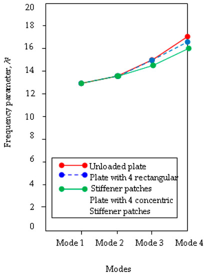 Comparison of variation of different frequency parameter with different modes for an unloaded plate and for a plate with 4 rectangular and 4 concentric stiffener patches.