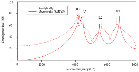 Comparison of sound power level analytically and numerically for annular plate attached with 4 rectangular stiffener patches and having parabolic decreasing thickness variations (Case I) for taper ratio Tx = 0.75.