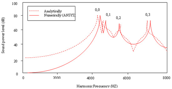 where, for the two normal surfaces of the plate the spatially average r.m.s velocity is represented as ts. Considering the plate thickness (h) effect, the sum of sound radiations [16] from two normal surfaces of the plate at (Z = 0.5 h and −0.5 h) will represent the modal sound power, which can be given by Equations (9)–(11):