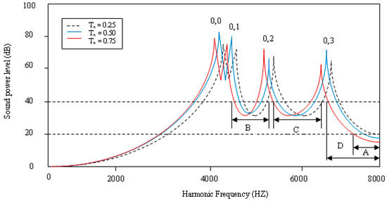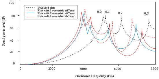 In this paper, the sound power level (dB, reference = of an annular circular plate with a different attachment of rectangular and concentric stiffener patches is estimated. The plate for the sound power level is analyzed for all cases of different parabolic thickness variation due to transverse vibration. The taper ratio is maintained from a range (0.00–0.75). The sound power level is investigated by applying 1 N concentrated load under time-varying harmonic excitations at different excitation locations at different nodes, and a harmonic frequency range of (0–8000) HZ is taken to determine the sound radiation characteristic. The Case I plate with parabolic decreasing thickness variation is taken as a convergence study. Figure 8 and Figure 9 compare the sound power level for a Case I plate obtained analytically and numerically for the taper ratio Tx = 0.75 for 4 rectangular stiffener patches and 4 concentric stiffener patches, respectively, for different modes. A good agreement of computed results is seen in the comparison of sound power as depicted from Figure 8 and Figure 9. Figure 10, Figure 11 and Figure 12 shows the numerical comparison of sound power level for Case I plate with different combinations of rectangular stiffener patches for different taper ratios and for different modes under forced excitation. From Figure 10, a sound power level up to 30 dB is seen, and we do not get any broad range of frequencies for different taper ratios for plate with 1 rectangular stiffener patch. However, for a sound power level up to 40 dB, we get all taper ratios, Tx = 0.00, 0.25, 0.50 and 0.75, with a broad range of frequencies in frequency band A only with 1 rectangular stiffener.