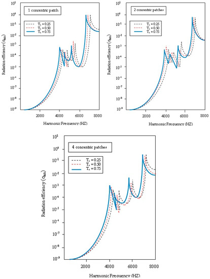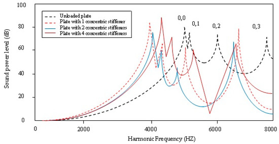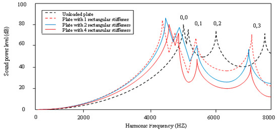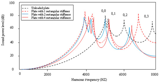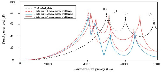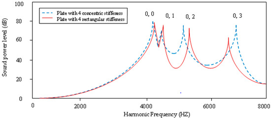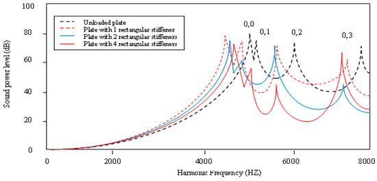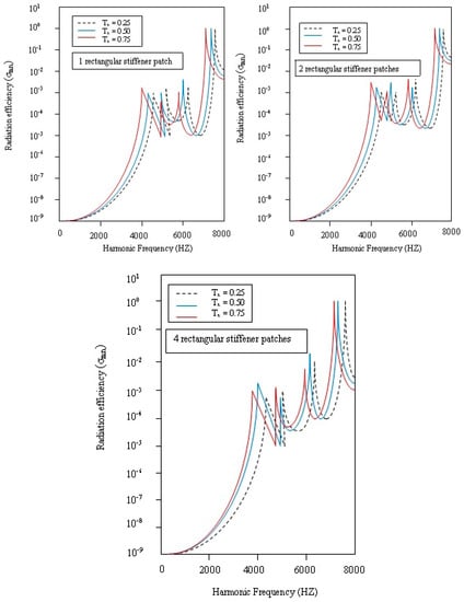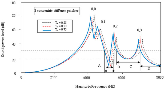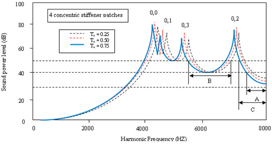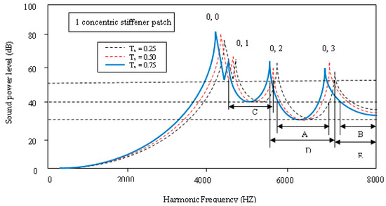 It is thus quite obvious that different combinations of rectangular and concentric stiffener patches have a significant impact on peak sound power level corresponding to the (0, 0) mode. Furthermore, different combinations of rectangular and concentric stiffener patches with different taper ratios provide us design options for peak sound power level. For example, for peak sound power reduction, taper ratio Tx = 0.75 with 4 rectangular stiffener patches and 4 concentric stiffener patches combination, as well as taper ratio Tx = 0.50 with 2 rectangular stiffener patches combination, for a Case III plate may be the options. Similarly, for sound power actuation, taper ratio Tx = 0.75 with 1 rectangular stiffener patch and 1 concentric stiffener patch combination for a Case I plate and 2 rectangular stiffener patches and 4 concentric stiffener patches combination for a Case II plate may be the alternative solution. However, for an unloaded tapered plate, it can be added that for taper ratio Tx = 0.75 for a Case III plate may be considered as a poor sound emitter and a taper ratio Tx = 0.75 for a Case I and Case II plate may be considered as the highest sound emitter.