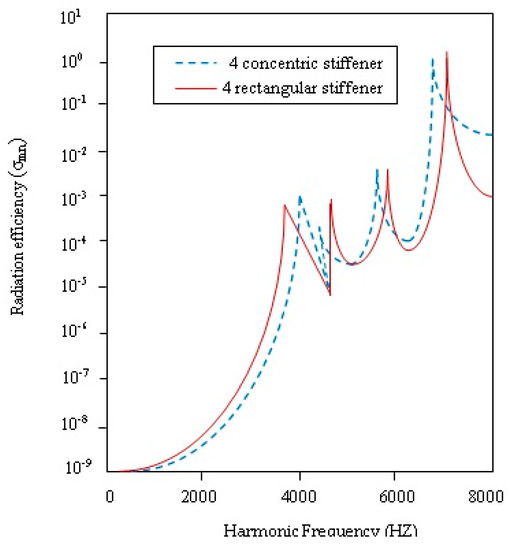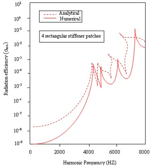 Figure 22 and Figure 23 compare the analytical and numerical comparison of radiation efficiency (σmn) for a Case I plate with 4 rectangular stiffener patches and 4 concentric stiffener patches respectively having parabolically decreasing thickness variation for taper ratio Tx = 0.75. A good agreement of results is seen in the comparison of radiation efficiency as reported in Figure 22 and Figure 23. Figure 24 and Figure 25 show the variation of radiation efficiency with different taper ratios Tx for different combination of rectangular and concentric stiffener patches for a Case I plate with parabolically decreasing thickness variation. It is seen that for all combinations of rectangular and concentric stiffener patches, the effect of radiation efficiency due to different taper ratios is independent of exciting frequency up to 1000 HZ, but at a given forcing frequency a higher taper ratio causes higher radiation efficiency beyond 1000 HZ. However, sound power level peaks do shift towards a lower frequency as taper ratio increases. For higher frequency beyond 2000 HZ, different taper ratios alter its stiffness at higher forcing frequency and the radiation efficiency curves tend to intersect each other at this high forcing region. It is interesting to note that the radiation curve tends to unity in the frequency band 6800–7200 HZ and a clear peak is seen at this frequency band for all combination of rectangular and concentric stiffener patches. Furthermore, from Figure 24 and Figure 25 it is seen that the radiation efficiency increases with the taper ratio for all combinations of rectangular and concentric stiffener patches. Out of these combinations, the Case II plate with 2 rectangular stiffener patches and 2 concentric stiffener patches delivers the highest radiation efficiency whereas Case I plate with both 1 rectangular and 1 concentric stiffener patch and 4 rectangular and 4 concentric stiffener patches is seen to be a moderate radiator as depicted in Table 7. However, at higher forcing frequency, it is seen that both a plate with 4 rectangular and 4 concentric stiffener patches with all cases of thickness variation (Cases I, II and III) shows the least radiation efficiency for all combinations of rectangular stiffener patches, as evident from Table 7.Therefore, it is interesting to mention that a Case III plate shows the lowest radiation efficiency (σmn) for all cases of thickness variations and is a poor radiation emitter among all the thickness variations with different combinations of rectangular and concentric stiffener patches. Figure 26 shows the numerical comparison of radiation efficiency for a plate with both 4 rectangular and 4 concentric stiffener patches for taper ratio Tx = 0.75. It is found that the plate shows almost the same radiation efficiency as depicted from Figure 26. Figure 27 shows the numerical comparison of the sound power level for a plate with 4 rectangular and 4 concentric stiffener patches for taper ratio Tx = 0.75. It is observed that both the plates show almost the same peak for taper ratio Tx = 0.75. Hence, the effect of stiffness variation along with the modes has negligible effect for both the combinations.