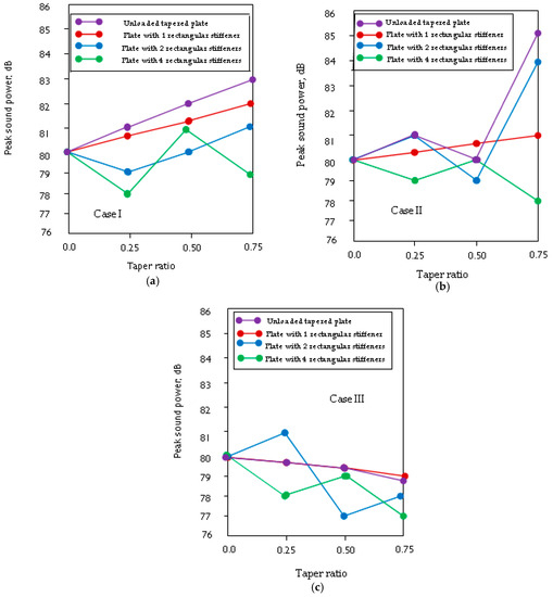Comparison of peak sound power level (dB) for (a) Case I, (b) Case II, and (c) Case III plates having different parabolic thickness variations with different attachments of rectangular stiffener patches.