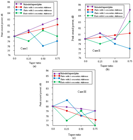 Comparison of peak sound power level (dB) for (a) Case I, (b) Case II, and (c) Case III plates having different parabolic thickness variations with different combinations of concentric stiffener patches.