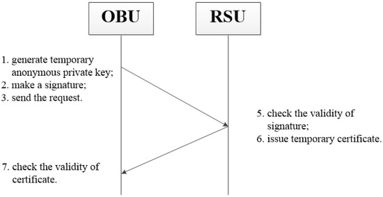 In Figure 2, we describe the flowchart of temporary anonymous key generation. When the vehicle enters the area of the RSU, it firstly generates its temporary short-time anonymous private key. Then, the vehicle makes a signature as its proof and sends the request information to RSU. After receiving the request, the RSU checks the validity of signature at first. If it is valid, the OBU is authenticated. The RSU issues the temporary certificate and sends back to the vehicle. When receiving the certificate, the vehicle checks its validity. If valid, the RSU is also authenticated and the certificate is accepted. Next, we will give the detailed process of OBU temporary anonymous key generation in Table 2.