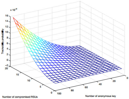 From Figure 3 below, it can be seen that the tracking probability increases very slowly with the increase of the number of anonymous keys and the number of compromised RSUs. So it is long-term unlinkability.