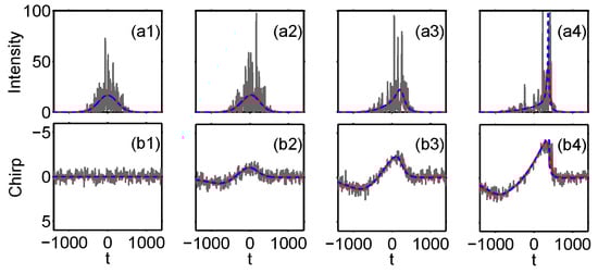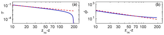 Numerical integration of the coupled system of characteristic ODE (5)–(9): Evolutions during the propagation of the gradient of the momentum (a) and intensity envelope of the incoherent pulse (b) along a characteristic nearby the singularity. Their evolutions exhibit the power-law divergence predicted by the theory in Equation (11) (dashed red lines) ().