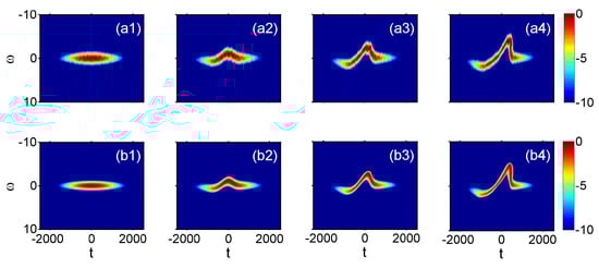 where is the temporal profile of the averaged intensity of the incoherent wave, and is the effective potential. Please note that since the statistics of the pulse is not stationary in time, the spectrum depends on the time position, i.e., it denotes the spectrogram of the optical pulse. The Vlasov Equation (2) conserves the total power . Contrary to the spatial case [], in the temporal domain the potential is constrained by the causality of , which breaks the Hamiltonian structure of the Vlasov Equation (2) []. In the same way, the total momentum , is no longer conserved []. Please note that the Vlasov equation governs the evolution of the averaged spectrum , which is inherently a deterministic (smooth) function of the phase-space variables . In contrast, the NLS equation governs the evolution of an initial random function , which remains stochastic during the propagation in z. We compare the evolutions of the spectrograms of (e.g., Figure 2a) with the corresponding averaged spectra obtained from the numerical integration of the Vlasov equation e.g., Figure 2a)—we do not perform averages over the realizations of the initial random condition . We also note that in Figure 1 (as well as Figures 5 and 8) the direct comparison between the NLS and Vlasov simulations has been improved by smoothing the NLS data with an averaging over nearest-neighbor points (smooth MATLAB function).